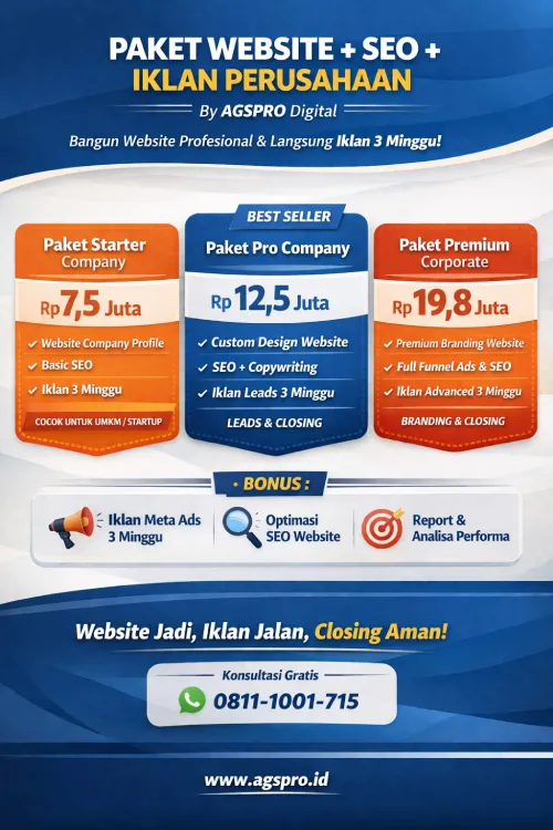 Jangan biarkan bisnis Anda tertinggal di era digital. Dengan jasa pembuatan website company profile AGSPro, Anda mendapatkan lebih dari sekadar website—Anda mendapatkan alat pemasaran yang bekerja 24 jam untuk bisnis Anda. Saatnya tampil lebih profesional, lebih dipercaya, dan lebih unggul dari kompetitor. Baca juga : https://jasapembuatanwebsite.pro/jasa-bikin-web-rangking-1-google-agspro/